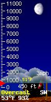 WXSIM forecast: Dense overcast. A chance of rain in the evening, then rain likely after midnight. Low 10°. Wind south-southeast around 22 kph, gusting to 42 kph, in the evening, becoming 42 kph, gusting to 64 kph, after midnight. Chance of precipitation 80 percent. Precipitation mostly between 10 and 20 mm.