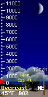 WXSIM forecast: Cloudy in the evening, becoming partly cloudy after midnight. Patchy light fog. A chance of rain in the evening, then a slight chance of rain after midnight. Low 4°. Wind west-northwest around 24 kph, gusting to 36 kph, in the evening, becoming west-southwest around 15 kph, gusting to 37 kph, after midnight. Chance of precipitation 50 percent. Precipitation mostly between 2 and 5 mm.